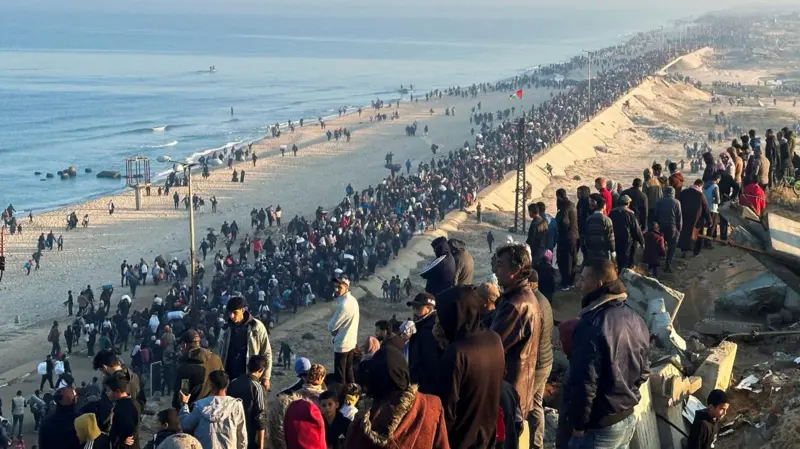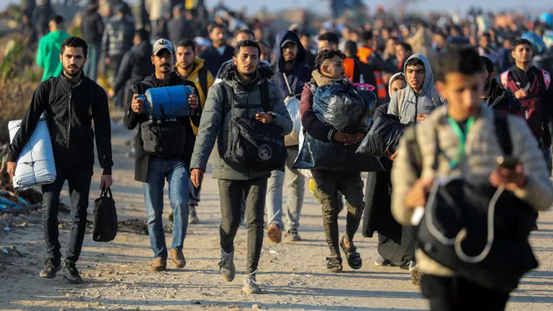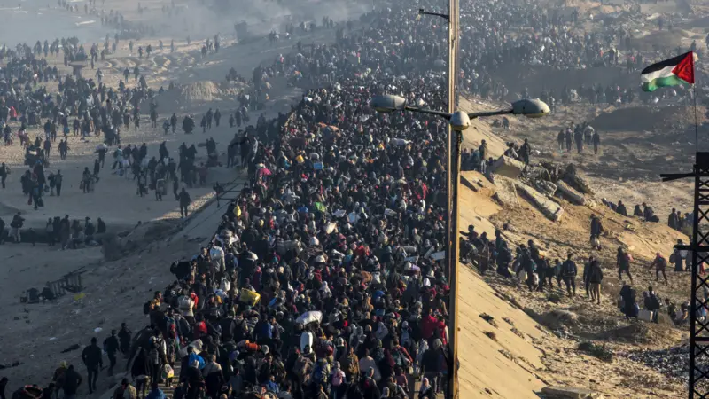 နှစ်ဘက်အပစ်အခတ်ရပ်စဲရေး ကြေညာမှုကြောင့် ထောင်ပေါင်းများစွာသော ဒေသခံလူအုပ်ကြီးသည် ၅ မိုင်ခန့် ရှည်လျားသည့် လူတန်းကြီးဖြစ်ပေါ်ကာ ဂါဇာမြောက်ခြမ်းသို့ တရွေ့ရွေ့ဝင်ရောက်လျက်ရှိသည်။