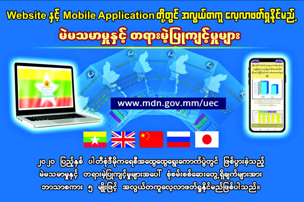 ၂၀၂၀ ပြည့်နှစ် ပါတီစုံဒီမိုကရေစီ အထွေထွေရွေးကောက်ပွဲတွင် ဖြစ်ပွားခဲ့သည့် “မဲမသမာမှုနှင့် တရားမဲ့ပြုကျင့်မှုများ” အပေါ် စုံစမ်းစစ်ဆေး တွေ့ရှိချက်များနှင့် စပ်လျဉ်း၍ ပြည်တွင်း၊ ပြည်ပမှ လေ့လာလိုသူများအနေဖြင့် www.mdn.gov.mm/uec တွင် မြန်မာ၊ အင်္ဂလိပ်၊ တရုတ်၊ ရုရှား၊ ဂျပန် စသည့် ဘာသာစကား (၅)မျိုးဖြင့် လွှင့်တင်ထားပြီး Mobile Application ကိုလည်း Download ရယူ၍ လေ့လာဖတ်ရှုနိုင်ကြေင်း သိရသည်။
