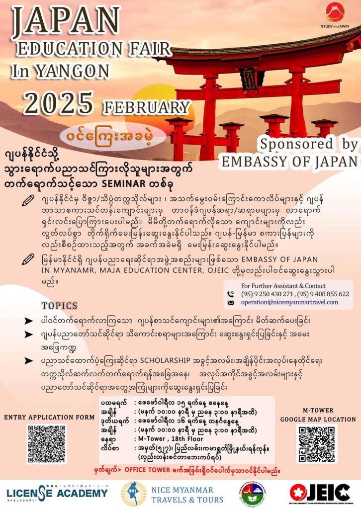 ဂျပန်ပညာရေးပြပွဲ(ရန်ကုန်) ၂၀၂၅ ကို ဖေဖော်ဝါရီလ ၁၅ ရက်နှင့် ၁၆ ရက်တို့တွင် နံနက် ၁၀ နာရီမှ ညနေ ၃ နာရီအထိ ရန်ကုန်မြို့၊ ကမာရွတ်မြို့နယ် ပြည်လမ်းရှိ အမှတ် (၅၂၇) M-Tower ၁၈ လွှာမှာ ကျင်းပသွားမည်ဖြစ်ကြောင်း သိရပါတယ်။