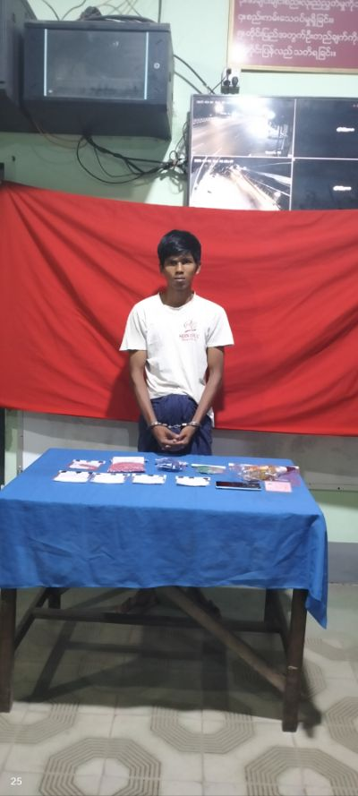 ယမန်နေ့ည ၁၁ နာရီအချိန်ခန့်က လုံခြုံရေးပူးပေါင်းအဖွဲ့သည် လှည့်ကင်းပတ်ကင်းဆောင်ရွက်နေစဉ် သင်္ဃန်းကျွန်းကြီးကျေးရွာအုပ်စု၊ မြရတနာကျေးရွာ၊ ပိတောက်ဝါလမ်း၊အိမ်အမှတ်(၁၂၄၁)တွင် မူးယစ်ဆေးဝါးများရောင်းချနေကြောင်း ပြည်သူတို့၏သတင်းပေးပို့ချက်အရ ဝင်ရောက်ရှာဖွေဖမ်းဆီးရာ သန့်ဇင်ထွန်း(ခ)ကနား ၏ နေအိမ်သို့ ဝင်ရောက်ရှာဖွေရာ ၄င်းသည် အိပ်ယာဘေးတွင်ထိုင်လျက်အနေထားဖြင့် တွေ့ရသည်။.