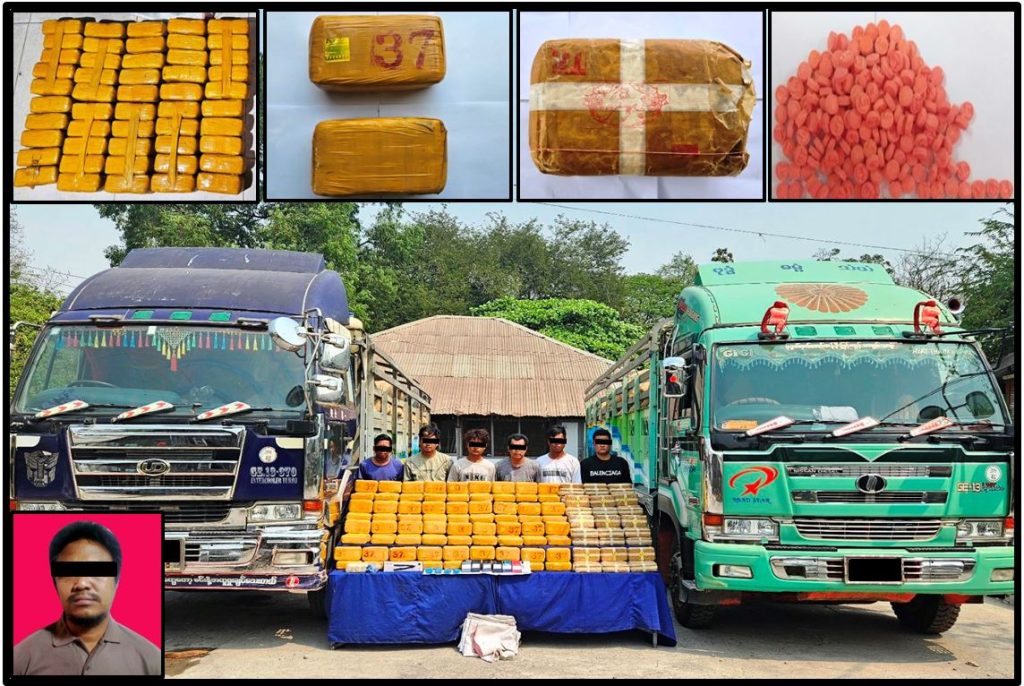မူးယစ်ဆေးဝါးတားဆီးနှိမ်နင်းရေးရဲတပ်ဖွဲ့မှ တပ်ဖွဲ့ဝင်များပါဝင်သော ပူးပေါင်းအဖွဲ့သည် မတ်လ ၁၄ ရက်နေ့ ညနေ ၄ နာရီခွဲအချိန် မန္တလေးတိုင်းဒေသကြီး၊ ပြည်ကြီးတံခွန်မြို့နယ်၊ ၁၃၄ လမ်းနှင့် ၇၈ လမ်း ထောင့်၌ အောင်နိုင်ထွေး(ခ)ဖိုးသား မောင်းနှင်ပြီး ရဲလင်းဖြိုး လိုက်ပါလာသည့် NISSAN ၁၂ ဘီးမော်တော် ယာဉ်နှင့် နန်းလင်း မောင်းနှင်ပြီး ရဲဝင်းထက် လိုက်ပါလာသည့် NISSAN ၁၂ ဘီး မော်တော်ယာဉ်တို့ကို သတင်းအရရှာဖွေရာ အဆိုပါယာဉ် ၂ စီးပေါ်တွင် ကုန်ပစ္စည်းများဖြင့် ဖုံးအုပ် သယ်ဆောင်လာသည့် စိတ်ကြွရူးသွပ်ဆေးပြား ၁၀ ဒသမ ၁ သိန်း သိမ်း ဆည်းရမိခဲ့ကြောင်း သိရသည်။
