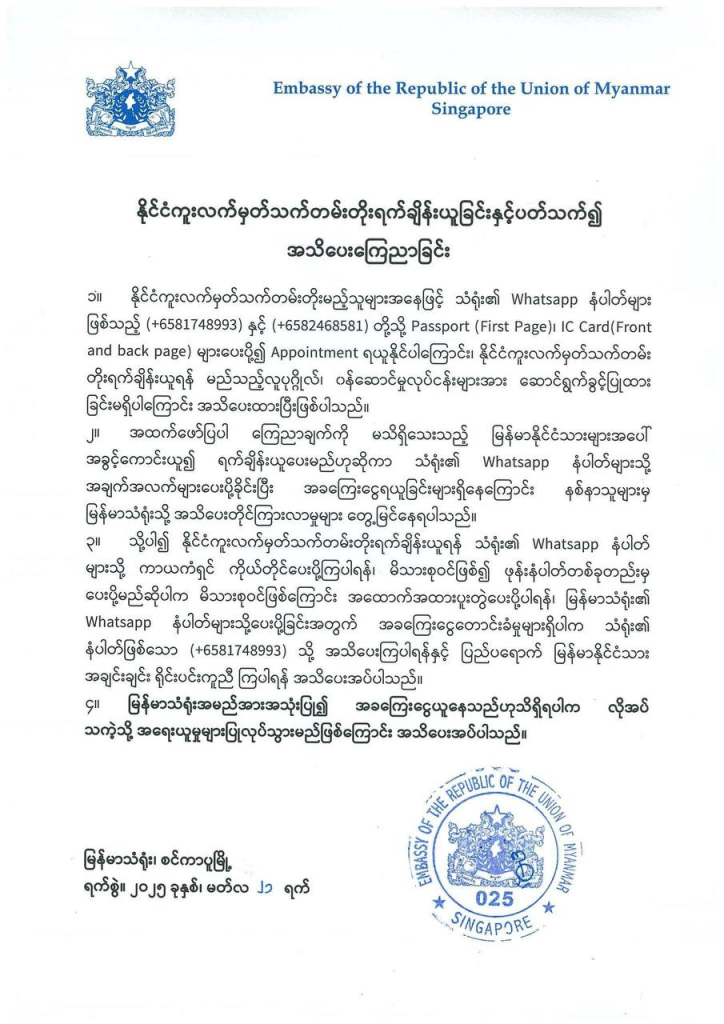 သံရုံးအနေနဲ့ အသုံးပြု၍ နိုင်ငံကူးလက်မှတ်သက်တမ်းတိုး ရက်ချိန်းယူရန် မည်သည့် လူပုဂ္ဂိုလ်၊ ဝန်ဆောင်မှု လုပ်ငန်းကိုမှ ဆောင်ရွက်ခွင့် မပြုထားကြောင်းလည်း သံရုံးက အသိပေးထားပါတယ်။ နိုင်ငံကူးလက်မှတ် သက်တမ်းတိုး သူများအနေဖြင့် What sApp ဖုန်းနံပါတ် (+6581748993) နှင့် (+65 82468581) သို့ Passport (First Page)၊ IC Card (Front and back page) များပေးပို့၍ Appointment ကြိုတင်ယူရန် လိုအပ်ကြောင်း ထုတ်ပြန်ချက်မှာ ဖော်ပြထားရှိ ပါတယ်။