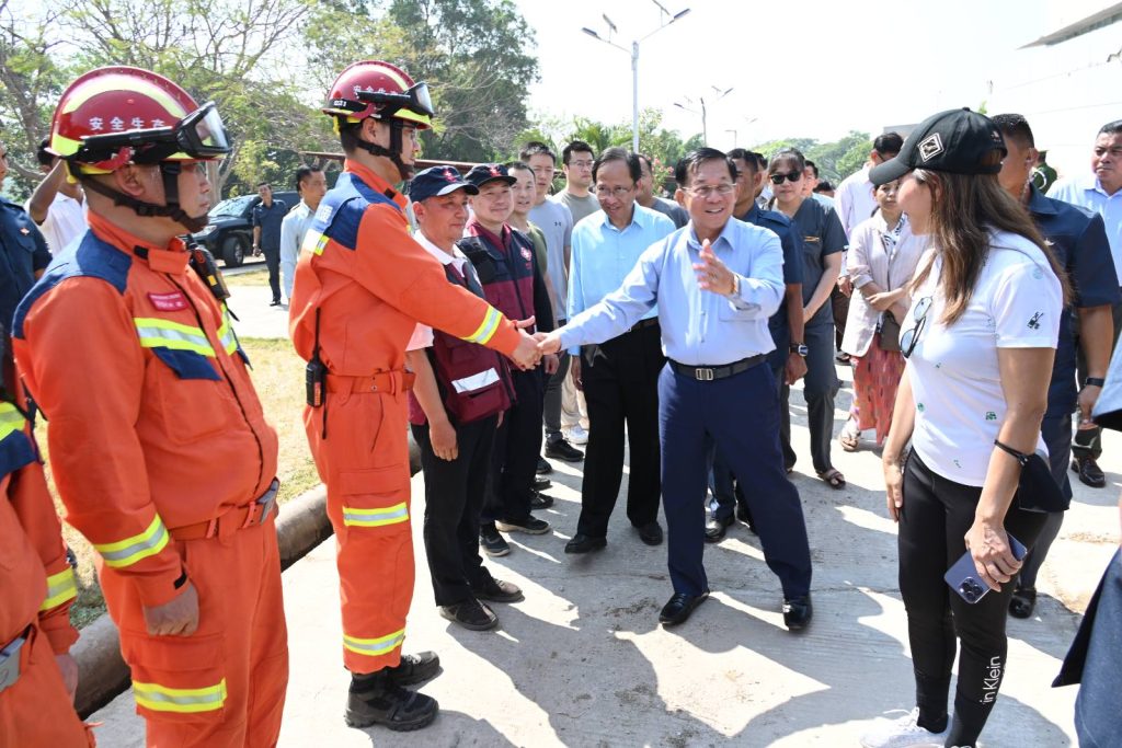 ထိုသို့ကြည့်ရှုစစ်ဆေးစဉ် နိုင်ငံတော်စီမံအုပ်ချုပ်ရေးကောင်စီဥက္ကဋ္ဌ နိုင်ငံတော် ဝန်ကြီးချုပ်သည် မြန်မာနိုင်ငံမှ ကူညီကယ်ဆယ်ရေးဝန်ထမ်းများနှင့်အတူ ကူညီကယ် ဆယ်ရေးလုပ်ငန်းများအတူတကွပူးပေါင်း ဆောင်ရွက်ပေးလျက်ရှိသည့် ငလျင်လှုပ်ခတ် ပြီးနောက် ၁၈ နာရီအတွင်း မြန်မာနိုင်ငံသို့ ပထမဆုံးသောရောက်ရှိလာသော တရုတ် နိုင်ငံယူနန်ပြည်နယ်ကယ်ဆယ်ရေးဆေးကုသမှုအဖွဲ့မှ အဖွဲ့ဝင်များအား ရင်းရင်းနှီးနှီး နှုတ်ဆက်၍ ကျေးဇူးတင်စကားပြောကြားသည်။