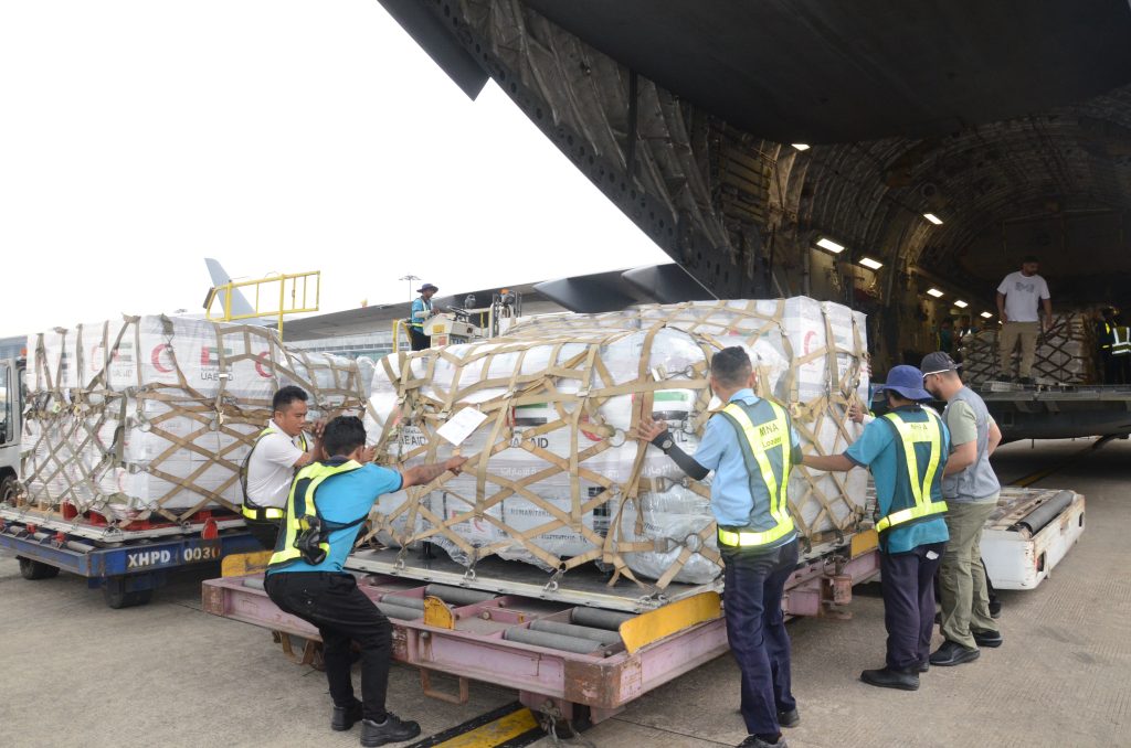 ဆက်လက်ပြီး ယမန်နေ့မွန်းလွဲပိုင်းတွင် ယူအေအီးနိုင်ငံ၊ UAE Air Force မှ Cargo Flight (ကယ်ဆယ်ရေးပစ္စည်း)တင်ဆောင်လာသည့်လေယာဉ်သည် မြန်မာနိုင်ငံ ငလျင်ဘေးဒဏ်သင့် ဒေသများအတွက် လှူဒါန်းသည့်အစားအစာများနှင့် ယာယီတဲများ စုစုပေါင်း (၃၆)ထုပ်၊ (၃၃၅၈၂)kg တင်ဆောင်၍ရောက်ရှိလာရာ ရန်ကုန်တိုင်းဒေသကြီးအစိုးရအဖွဲ့ဝန်ကြီးချုပ် ဦးစိုးသိန်း၊ တိုင်းဒေသကြီးအစိုးရအဖွဲ့ ဝန်ကြီးများ၊ နိုင်ငံခြားရေးဝန်ကြီးဌာန၊ မဟာဗျူဟာလေ့လာရေးနှင့် လေ့ကျင့်ရေးဦးစီးဌာနမှ ညွှန်ကြားရေးမှူးချုပ် ဦးဇော်ဖြိုးဝင်း၊ လူမှုဝန်ထမ်း၊ ကယ်ဆယ်ရေးနှင့် ပြန်လည်နေရာချထားရေးဝန်ကြီးဌာန၊ ဘေးအန္တရာယ်ဆိုင်ရာစီမံခန့်ခွဲမှုဦးစီးဌာန၊ညွှန်ကြားရေးမှူး ဦးသန်းစိုးနှင့် တာဝန်ရှိသူများက လက်ခံကြိုဆိုခဲ့ကြကြောင်း သိရသည်။