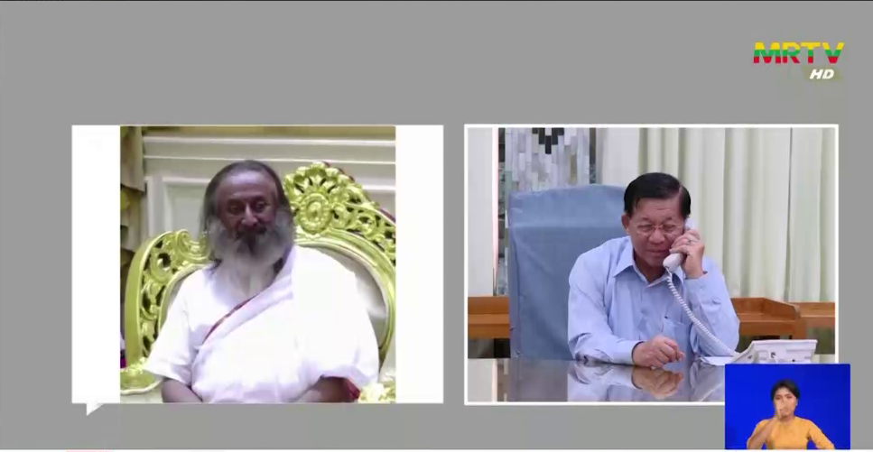 မြန်မာနိုင်ငံတွင် မန္တလေးငလျင်ကြီးလှုပ်ခတ်ခဲ့မှုကြောင့် ထိခိုက်ပျက်ဆီးမှုများဖြစ်ပေါ်ခဲ့မှုများနှင့် မြန်မာနိုင်ငံ၏ ပြည်တွင်းငြိမ်းချမ်းရေးနှင့်ပတ်သက်၍ နိုင်ငံတော်စီမံ အုပ်ချုပ်ရေးကောင်စီဥက္ကဋ္ဌ နိုင်ငံတော်ဝန်ကြီးချုပ် ဗိုလ်ချုပ်မှူးကြီး မင်းအောင်လှိုင် သည် ယနေ့နံနက်ပိုင်းတွင် အိန္ဒိယနိုင်ငံမှ လူသားချင်းစာနာထောက်ထားမှု ခေါင်းဆောင်နှင့် ငြိမ်းချမ်းရေးသံတမန် Gurudev Sri Sri Ravi Shankar နှင့် ဖုန်းဖြင့်ဆက်သွယ်ပြောကြားခဲ့ကြောင်း သိရသည်။