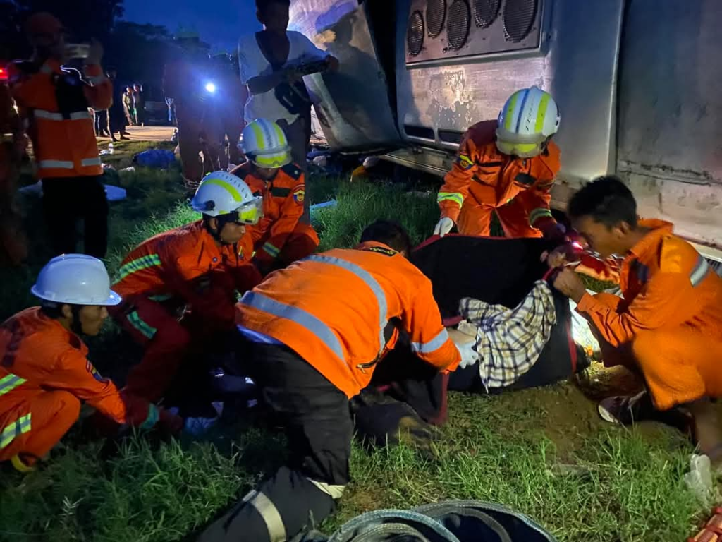 အဆိုပါ ခရီးသည်ယာဥ်တိမ်းမှောက်သည့်နေရာသို့ မိတ္ထီလာခရိုင်မီးသတ်စခန်းမှ Rescue & Towing ပိုလန်ရှာဖွေကယ်ဆယ်ရေးယာဉ်(၁)စီး၊ မီးငြှိမ်းသတ်ယာဉ်(၁)စီး၊ သူနာတင်ယာဉ် (၁)စီးနှင့် သန္ဓေမီးသတ်တပ်ဖွဲ့ဝင်များဖြင့် ကူညီကယ်ဆယ်ရေးလုပ်ငန်းများ သွားရောက်ဆောင်ရွက်ခဲ့ကြောင်း သိရသည်။