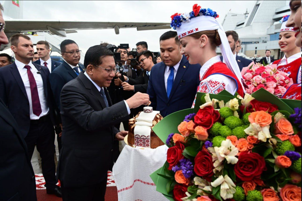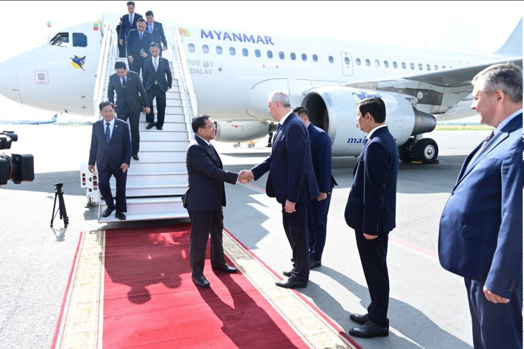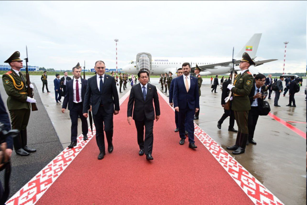 EAEU ၏အလှည့်ကျဥက္ကဋ္ဌ ဘယ်လာရုစ်နိုင်ငံသမ္မတ H.E. Mr. Alexander Grigoryevich Lukashenko ၏ဖိတ်ကြားချက်အရ ဘယ်လာရုစ်နိုင်ငံ၊ မင့်စ်မြို့၌ကျင်းပမည့် စတုတ္ထအကြိမ် ဥရောပ-အာရှစီးပွားရေးဖိုရမ်(EEF 2025)တက်ရောက်ရန် နစကဥက္ကဋ္ဌ၊ နိုင်ငံတော်ဝန်ကြီးချုပ်၊ ဗိုလ်ချုပ်မှူးကြီးမင်းအောင်လှိုင်သည် ဇွန်လ ၂၅ ရက် ညနေပိုင်းတွင် ဘယ်လာရုစ်နိုင်ငံ၊ မင့်စ်မြို့ရှိ အပြည်ပြည်ဆိုင်ရာလေဆိပ်သို့ ဆိုက်ရောက်ခဲ့ရာ ဘယ်လာရုစ်နိုင်ငံ၊ ဒုတိယဝန်ကြီးချုပ် Mr. Yuri Shuleiko၊ နိုင်ငံခြားရေးဝန်ကြီးဌာန၊ ဒုတိယဝန်ကြီး(၁) Mr. Lukashevich Sergey Vladimirovich နှင့်တာဝန်ရှိသူများ၊ ရုရှားနိုင်ငံနှင့်ဘယ်လာရုစ်နိုင်ငံဆိုင်ရာ မြန်မာနိုင်ငံသံအမတ်ကြီး ဦးသစ်လင်းအုန်း၊ မြန်မာစစ်သံ (ကြည်း၊ ရေ၊ လေ)ဗိုလ်မှူးချုပ်ကျော်စိုးဦးနှင့် မင့်စ်မြို့ရှိ မြန်မာနိုင်ငံကောင်စစ်ဝန်ချုပ် ဦးမိုးကျော်သူတို့က ကြိုဆိုနှုတ်ဆက်ခဲ့ကြပြီး ဘယ်လာရုစ်နိုင်ငံ နိုင်ငံတော်ဂုဏ်ပြုတပ်ဖွဲ့မှ နိုင်ငံ့ခေါင်းဆောင်များကို ကြိုဆိုတဲ့အစဉ်အလာနှင့် အညီဂုဏ်ပြုကြို ဆိုခဲ့ကြကြောင်း သိရသည်။