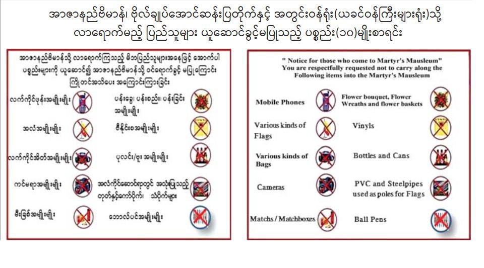 အဆိုပါနေရာများသို့ လာရောက်ကြမည့် ပြည်သူများအနေနဲ့ Drone ယာဉ်များယူဆောင်လာခြင်း၊ လွှတ်တင်ခြင်းများမပြုလုပ်ရန်နှင့် လက်ကိုင်ဖုန်း၊ အလံ၊ လက်ကိုင်အိတ်၊ ကင်မရာ၊ မီးခြစ်၊ ပန်းခွေ၊ ပန်းစည်း၊ ပန်းခြင်း၊ ဗီနိုင်း၊ ပုလင်း/ဗူး၊ အလံကိုင်ဆောင်ရာတွင်အသုံးပြုသည့် တုတ်နှင့် ကော်ပိုက်၊ သံပိုက်များနှင့် ဘောလ်ပင် စသည့်ပစ္စည်းအမျိုးမျိုးတို့အားယူဆောင်၍ ဝင်ရောက် ခွင့်မပြုကြောင်း ထုတ်ပြန်ထားပါတယ်။