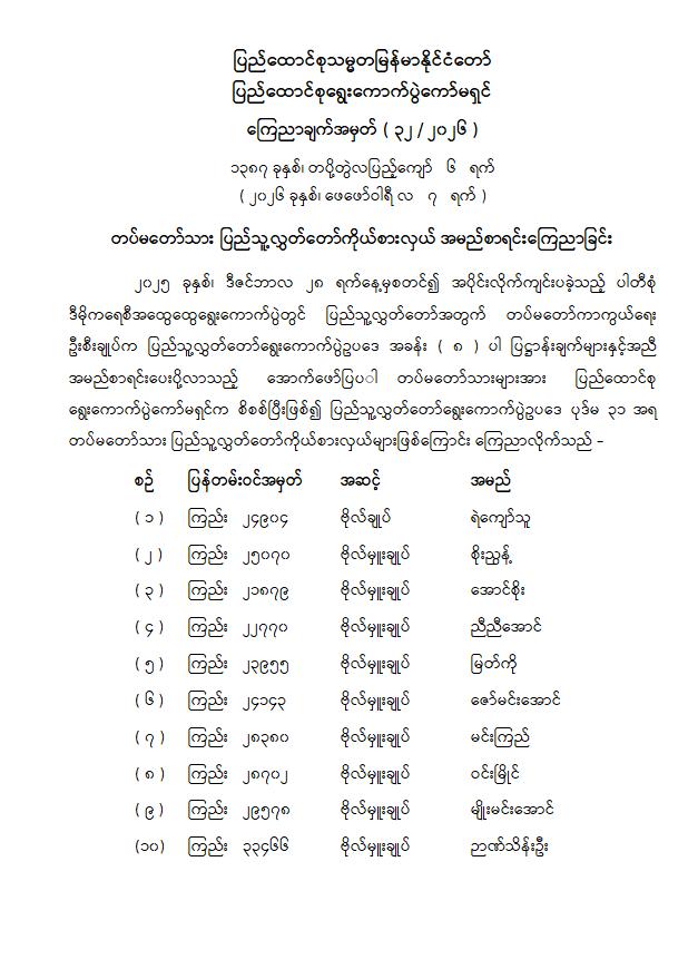 အပိုင်းလိုက်ကျင်းပပြီးခဲ့တဲ့ ပါတီစုံဒီမိုကရေစီအထွေထွေရွေးကောက်ပွဲမှာ ပြည်သူ့လွှတ်တော်အတွက် တပ်မတော်ကာကွယ်ရေးဦးစီးချုပ်က ပြည်သူ့လွှတ်တော်ရွေးကောက်ပွဲဥပဒေအခန်း (၈) ပါပြဌာန်းချက်တွေနဲ့အညီ အမည်စာရင်းပေးပို့လာတဲ့ တပ်မတော်သားတွေကို ပြည်ထောင်စုရွေးကောက်ပွဲကော်မရှင်က စိစစ်ပြီး ပြည်သူ့လွှတ်တော်ရွေးကောက်ပွဲဥပဒေ ပုဒ်မ ၃၁ အရ ပြည်သူ့လွှတ်တော်ကိုယ်စားလှယ်တွေအဖြစ် ကြေညာခဲ့တာဖြစ်ပါတယ်။