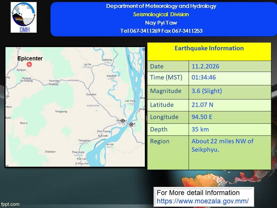 မကွေးတိုင်းဒေသကြီး၊ ဆိပ်ဖြူမြို့အနီးတွင် ယနေ့ ဖေဖော်ဝါရီ ၁၁ ရက် နံနက်အစောပိုင်းက အင်အားအနည်းငယ်ရှိသော မြေငလျင်တစ်ခု လှုပ်ခတ်ခဲ့ကြောင်း မိုးလေဝသနှင့် ဇလဗေဒညွှန်ကြားမှုဦးစီးဌာန၏ ထုတ်ပြန်ချက်အရ သိရသည်။