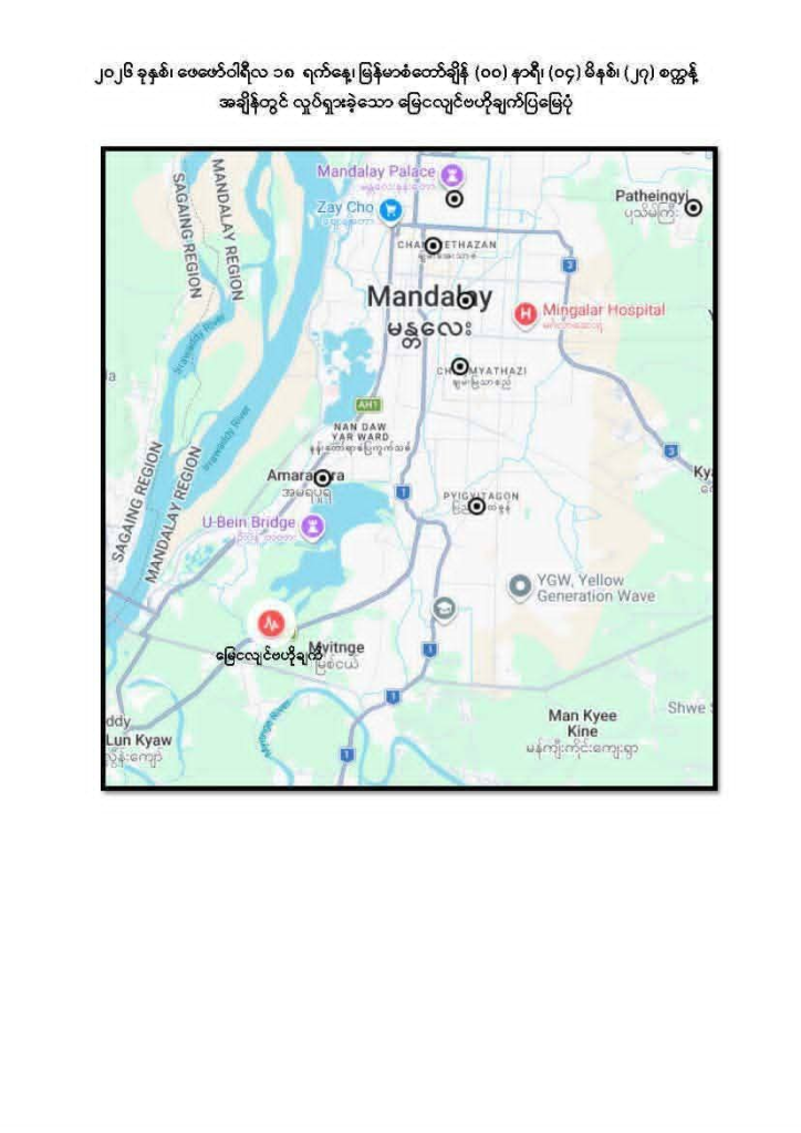 ထို့ပြင် နံနက် ၁၂ နာရီ ၄ မိနစ် ၂၇ စက္ကန့်ကလည်း အမရပူရမြို့နယ်၏တောင်-အနောက်တောင်ဘက်(၃)မိုင်ခန့်အကွာ၊ အနက်(၁၉)ကီလိုမီတာကိုဗဟိုပြု၍ အင် အားရစ်(ခ်)တာစကေး(၃ ဒသမ ၂)အဆင့်ရှိ အင်အားအနည်းငယ်ရှိသော ငလျင်တစ်ခုလှုပ်ခတ်ခဲ့ကြောင်း သိရသည်။