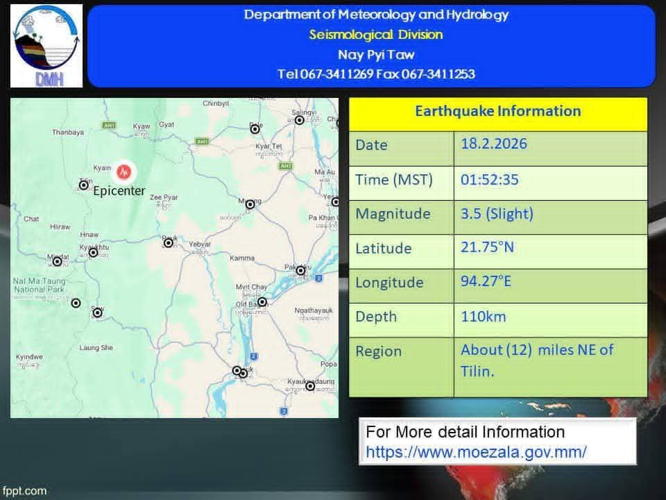 ယနေ့ ဖေဖော်ဝါရီ ၁၈ ရက်နံနက် ၁ နာရီ ၅၂ မိနစ် ၃၅ စက္ကန့်က ထီးလင်းမြို့၏ အရှေ့မြောက်ဘက်(၁၂)မိုင်ခန့်အကွာ၊အနက်(၁၁၀)ကီလိုမီတာကို ဗဟိုပြု၍ အင်အားရစ်(ခ်)တာစကေး(၃ ဒသမ ၅)အဆင့်ရှိ အင်အားအ နည်းငယ်ရှိသောငလျင်တစ်ခုလှုပ်ခတ်ခဲ့ကြောင်း သိရသည်။