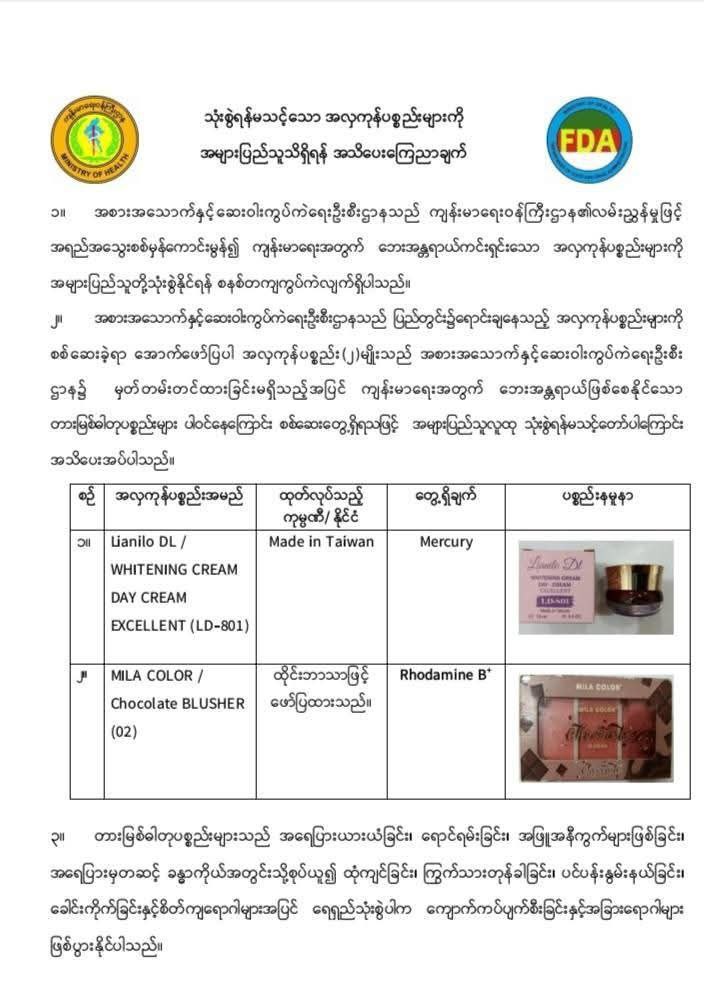 အစားအသောက်နှင့်ဆေးဝါးကွပ်ကဲရေးဦးစီးဌာနအနေနဲ့ ပြည်တွင်း၌ရောင်းချနေသည့် အလှကုန်ပစ္စည်း များကိုစစ်ဆေးခဲ့ရာ ဖော်ပြပါအလှကုန်ပစ္စည်းနှစ်မျိုးက အစားအသောက်နှင့်ဆေးဝါးကွပ်ကဲရေးဦးစီးဌာန၌ မှတ်တမ်းတင်ထားခြင်းမရှိသည့်အပြင် ကျန်းမာရေးအတွက် ဘေးအန္တရာယ်ဖြစ်စေနိုင်သော တားမြစ်ဓာတုပစ္စည်းများ ပါဝင်နေကြောင်း စစ်ဆေးတွေ့ရှိရသဖြင့် အများပြည်သူလူထုသုံးစွဲရန် မသင့်တော်ကြောင်း အသိပေးထုတ်ပြန် ခဲ့ပါတယ်။