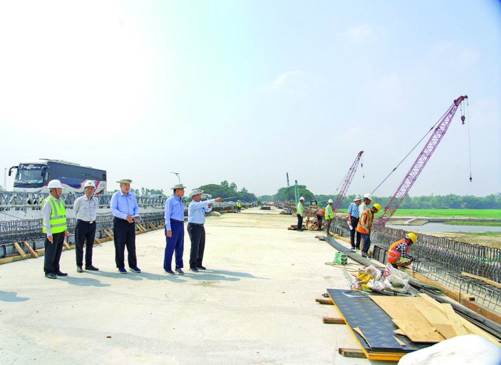 ထို့နောက် လုပ်ငန်းခွင်သို့ ဆက်လက်သွားရောက်ကာ Steel Plate Girder များ တပ်ဆင်ပြီးစီးမှု၊ ကြမ်းခင်းကွန်ကရစ်လောင်းခြင်းလုပ်ငန်းများ၊ Elastomeric Bearings များ တပ်ဆင်ထားရှိမှု၊ အရည်အသွေးထိန်းသိမ်းရေးလုပ်ငန်းများနှင့် ရေတိုက်စားမှုကာကွယ်ရေးဆောင်ရွက်ချက်များကို ကြည့်ရှုစစ်ဆေးပြီး လိုအပ်ချက်များကို ညွှန်ကြားခဲ့ကြောင်း သိရသည်။