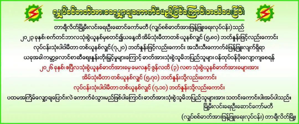 ယခုအခါ ဓာတ်အားအသုံးပြုသူများ၏ စရိတ်လျော့ပါးစေရန်အတွက် ၂၀၂၆ ခုနှစ် ဧပြီလမှ ဇွန်လအထိ သုံးလစာကာလအတွင်း သုံးစွဲယူနစ်ဓာတ်အားခများအား အိမ်သုံးမီတာ တစ်ယူနစ်လျှင် ၅.၇၀ ဘတ်နှုန်းသို့လည်းကောင်း၊ လုပ်ငန်းသုံးပါဝါမီတာ တစ်ယူနစ်လျှင် ၇.၁၀ ဘတ်နှုန်းသို့လည်းကောင်း ပထမအကြိမ်လျှော့ချပြောင်းလဲ ကောက်ခံသွားမည်ဖြစ်ကြောင်း သိရသည်။