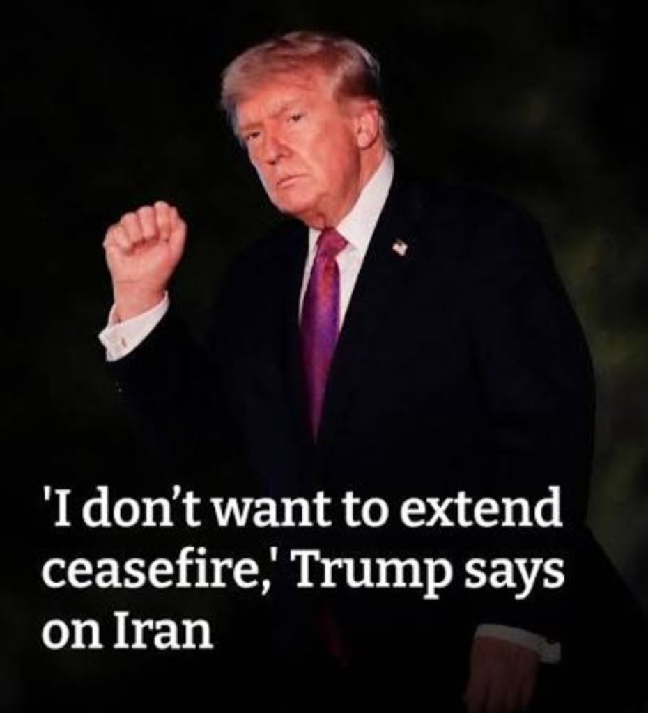 အမေရိကန်နှင့် အီရန်အကြား ချမှတ်ထားသည့် နှစ်ပတ်ကြာ အပစ်အခတ်ရပ်စဲရေးသည် လာမည့်ဗုဒ္ဓဟူး နေ့ (မနက်ဖြန်) တွင် သက်တမ်းကုန်ဆုံးတော့မည်ဖြစ်သော်လည်း၊ ညှိနှိုင်းမှုများအတွက် အချိန်ပိုပေးရန် အပစ်ရပ်သက်တမ်းတိုးမြှင့်ပေးဖို့ သမ္မတဒေါ်နယ်ထရန့်က ငြင်းဆိုလိုက်သည်။