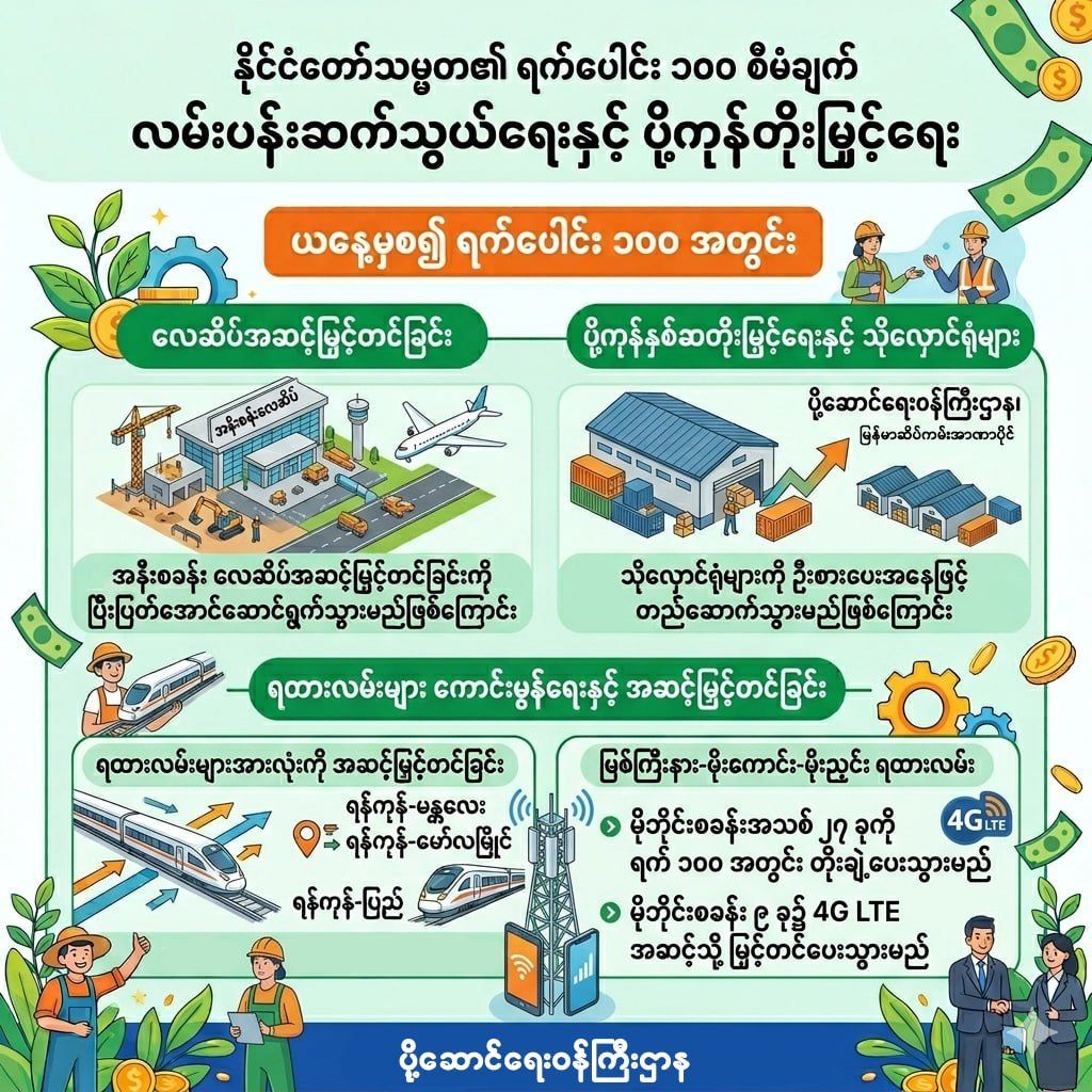 ထိုသို့ ဆောင်ရွက်ရာတွင် လတ်တလောအနေဖြင့် ရန်ကုန်–မန္တလေး ရထားလမ်း၊ ရန်ကုန်–မော်လမြိုင် ရထားလမ်းနှင့် ရန်ကုန်–ပြည် ရထားလမ်းများကို ဦးစားပေး အဆင့်မြှင့်တင်သွားမည်ဖြစ်ကြောင်း သိရသည်။