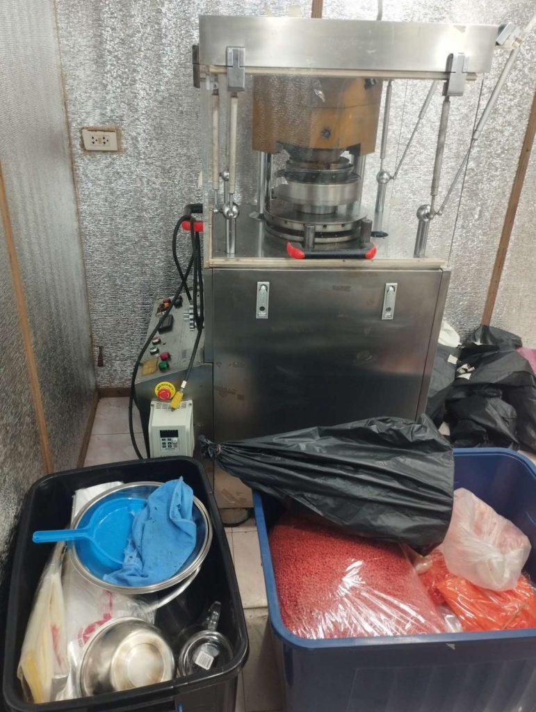 အဆိုပါ စိတ်ကြွရူးသွပ်ဆေးပြားများနှင့် မူးယစ်ဆေးဝါးများထုတ်လုပ်ရာတွင် အသုံးပြုသည့် ဆက်စပ်ပစ္စည်းများအား ထုတ်လုပ်ရောင်းဝယ်ပြုလုပ်သူ အိမ်ရှင် ပီလုံ(ခ)မိုင်ကျိုင်းလုံ၊ အမှတ်(ဆဆက-၄/၁၅၈)၊ ဆန်ဆိုင်း(က)ရပ်ကွက်၊ တာချီလိတ်မြို့(တိမ်းရှောင်)အား ဥပဒေနှင့်အညီအရေးယူ ဖမ်းဆီးရမိရေး ပူးပေါင်းအဖွဲ့များဖြင့် ပိတ်ဆို့ရှာဖွေစစ်ဆေးခြင်းများ ဆောင်ရွက်လျက်ရှိပါကြောင်း သိရသည်။
