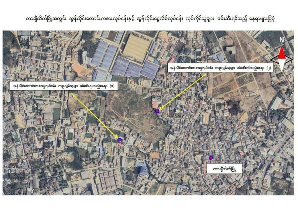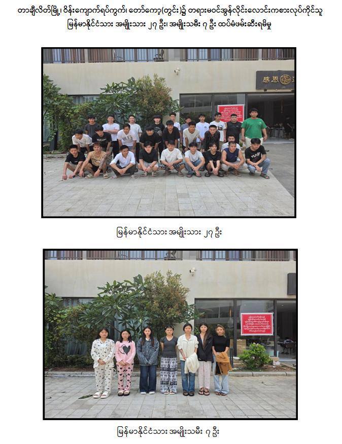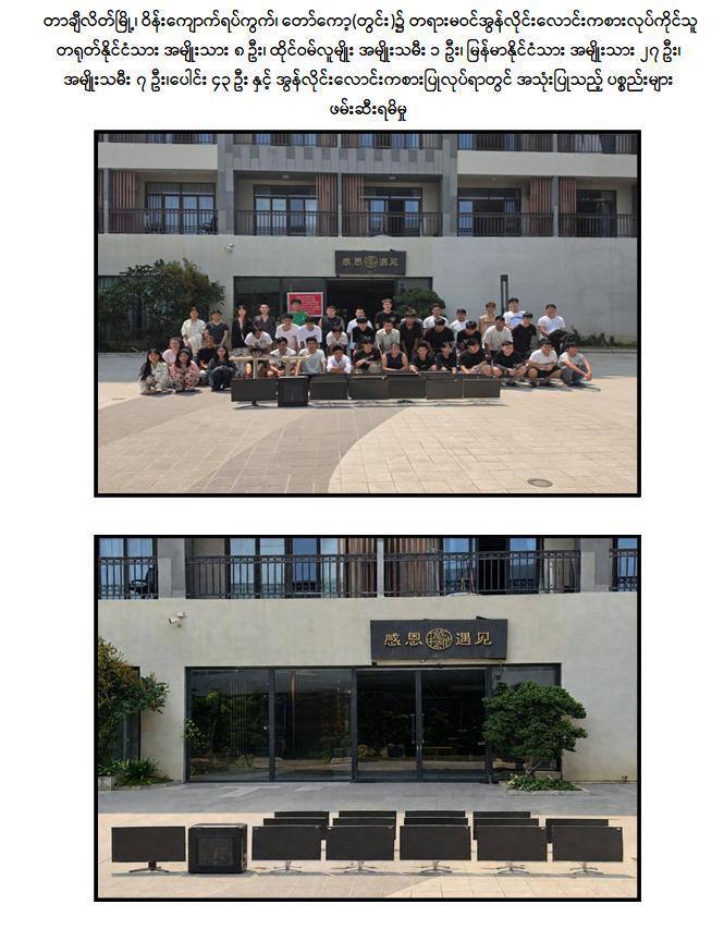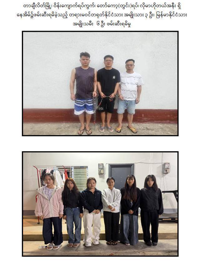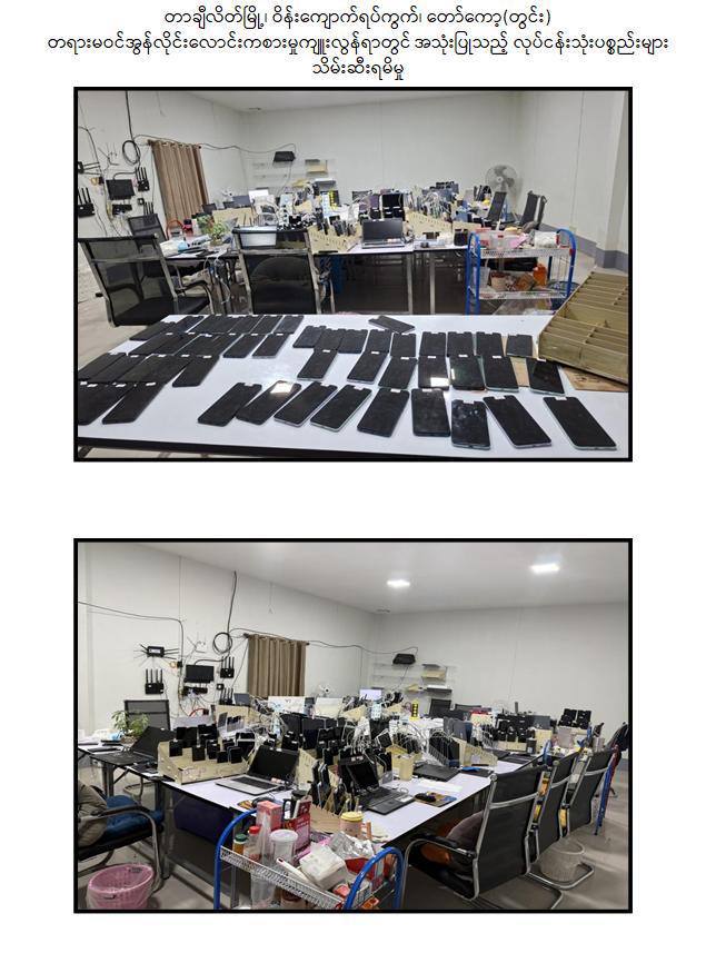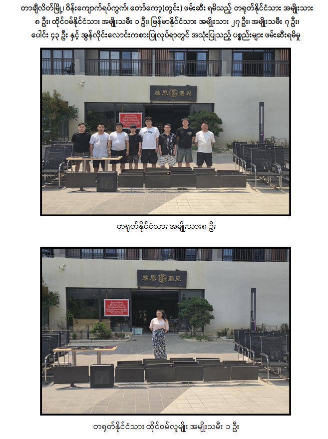 ယနေ့ နေ့လယ် ၁၁ နာရီ ၅၀ မိနစ်ခန့်တွင် တာချီလိတ်မြို့ ၊ ဝိန်းကျောက်ရပ်ကွက်၊တော်ကော့(တွင်း)ရပ်၊ လိုမာဟိုတယ်အနီး၌ အွန်လိုင်းလိမ်လည် လောင်းကစားမှုလုပ်ငန်းများ လုပ်ကိုင်နေသည့် တရုတ်နိုင်ငံသား အမျိုးသား ၃ ဦး၊ မြန်မာနိုင်ငံသားအမျိုးသမီး ၆ ဦးတို့ကို အွန်လိုင်းလိမ်လည်လောင်းကစားမှုလုပ်ငန်းများ လုပ်ကိုင်ရာတွင်အသုံးပြုသည့် All In One Computer ၃ လုံး၊ Laptop ၁၃ လုံး၊ ဖုန်းမျိုးစုံ ၃၂၀ လုံး၊Tablet မျိုးစုံ ၁၀၈ လုံး၊ Printer ၁ လုံး၊ Wifi စက် ၆ လုံးနှင့် ဆက်စပ်ပစ္စည်းများနှင့်အတူဖမ်းဆီးထိန်းသိမ်းရမိခဲ့သည်။ဆက်လက်၍ လုံခြုံရေးတပ်ဖွဲ့ဝင်များပါဝင်သော ပူးပေါင်းအဖွဲ့က ရှာဖွေစစ်ဆေးမှုများ ဆက်လက်ဆောင်ရွက်ခဲ့ရာ မွန်းလွဲ ၂ နာရီ ၁၀ မိနစ်ခန့်တွင် အဆိုပါ ရပ်ကွက်အတွင်း နေအိမ်တစ်လုံး၌ အွန်လိုင်းလိမ်လည်လောင်းကစားမှု လုပ်ငန်းများ ကျူးလွန်လျက်ရှိသည့် တရုတ်နိုင်ငံသား အမျိုးသား ၈ ဦး၊ တရုတ်နိုင်ငံသား ထိုင်ဝမ်လူမျိုးအမျိုးသမီး ၁ ဦး၊ မြန်မာနိုင်ငံသား အမျိုးသား ၂၇ ဦး နှင့် အမျိုးသမီး ၇ ဦး တို့ကိုအွန်လိုင်းလိမ်လည်လောင်းကစားမှု ကျူးလွန်ရာတွင် အသုံးပြုသည့် All In OneComputer ၂၃ လုံး၊ မော်နီတာ ၁ လုံး၊ SYSTEM ပုံး ၁ လုံး၊ ဖုန်းမျိုးစုံ ၅၂ လုံးနှင့် ဆက်စပ်ပစ္စည်းများနှင့်အတူ ထပ်မံဖမ်းဆီးထိန်းသိမ်းနိုင်ခဲ့သောကြောင့် တရားမဝင် အွန်လိုင်းလိမ်လည်မှုနှင့်လောင်းကစားမှု ကျူးလွန်သူ စုစုပေါင်း ၅၂ ဦးနှင့် လုပ်ငန်းသုံး ပစ္စည်းများအား ဖမ်းဆီးထိန်းသိမ်းနိုင်ခဲ့သည်။