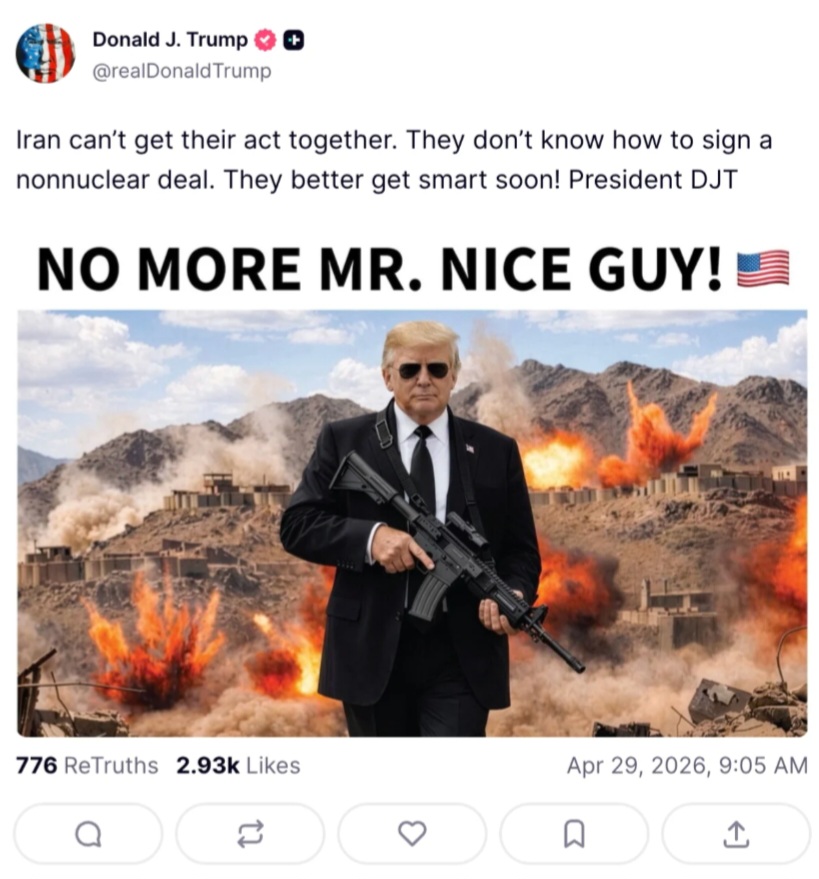 သမ္မတထရန့်သည် ၎င်း၏ Truth Social လူမှုကွန် ရက်စာမျက်နှာတွင် ၎င်းကိုယ်တိုင် သေနတ်တစ်လက် ကိုင်ဆောင်ထားသည့် ပြုပြင်ထားသော ပုံရိပ်တစ်ခုကို တင်ခဲ့ပြီး “နျူကလီးယားမဟုတ်သော သဘောတူညီချက်” (Nonnuclear deal) ကိုသာ လက်ခံမည်ဖြစ် ကြောင်း အချက်ပြခဲ့သည်။ လက်ရှိတွင် ပါကစ္စတန်နိုင်ငံက ကြားဝင်စေ့စပ်ပေးနေပြီး လာမည့်ရက်အနည်းငယ်အတွင်း အီရန်ထံမှ ပြင်ဆင်ထားသည့် အဆိုပြုချက်အသစ်ကို လက်ခံရရှိရန် မျှော်လင့်နေကြောင်း သတင်းများက ဆိုသည်။