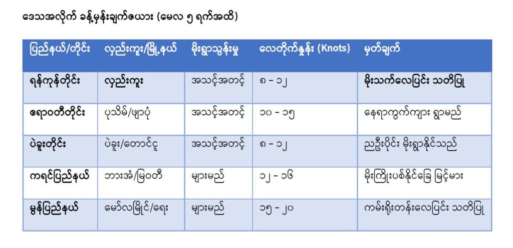 ကရင်နှင့် မွန်ပြည်နယ်များတွင် မေလ ၃ ရက်မှ ၅ ရက်အတွင်း မိုးအသင့်အတင့်မှ မိုးများအထိ ဖြစ်နိုင်ပြီး ကမ်းရိုးတန်းဒေသများတွင် လေတိုက်နှုန်း ၁၅ knots အထက် ရှိနိုင်ကြောင်း သိရသည်။